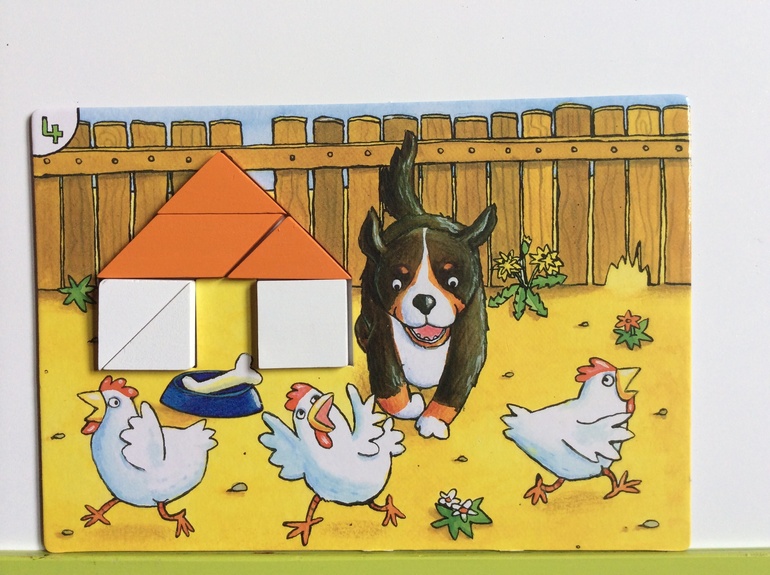 На каждой карточке в левом верхнем углу есть цифра. Это задание. В идеале ребенок должен собрать фигуру животного или предмет на картинке, использовав определенное количество геометрических фигур.