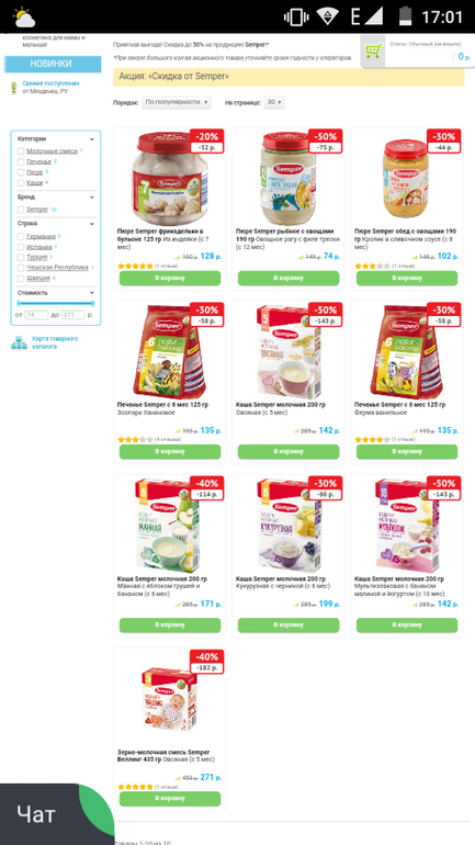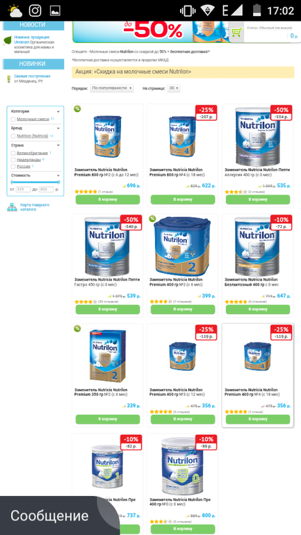 Скрины того, что меня заинтересовало! Нутрилон 2-696р и веллинг Семпер (дочь его обожает) по отличной цене 271р!!! При заказе можно использовать промокод "Младенец" минус еще 200р. Может кому пригодится. У них полно еще разных акций, например на каши Беби ситтер 33%