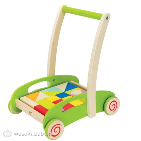 Еще что более-менее пошло это каталка большая с кубиками. Она поразумевается как толокар, но наш пока еще не допер что можно на нее опираться и ходить - зато кубики ему очень нравятся. Любые) И вообще такие небольшие разноцветные формочки у нас хорошо идут - от пирамидки там например или конструктора деревянного. Он возьмет кубик какой-нить и ползает с ним, встает, кладет его на диван например, потом забирает с дивана и так далее. Толокар этот просто сидя катает. Вот такой примерно у нас: