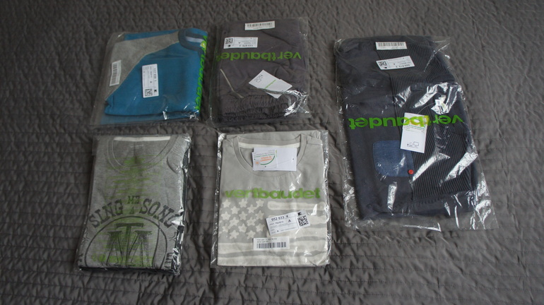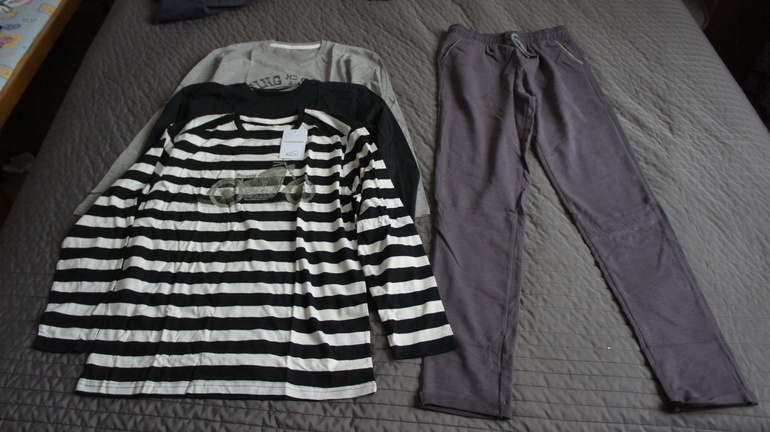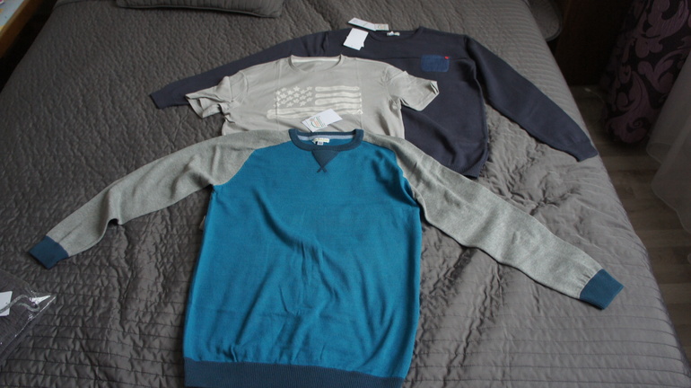 Первая часть - 2 свитера и футболка. Очень приятный хлопок, темно-синий поплотнее. Можно уже начинать темный носить, слегка овер-сайз. Нижний ждет еще один размер точно)))