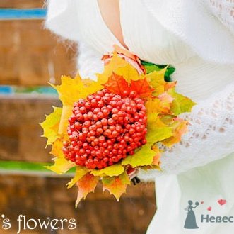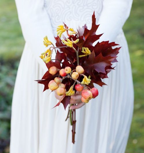 А дополнить образ можно букетом из роскошных листьев, фруктов и ягод.