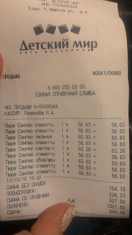 Случайно обратила внимание на чек ))я все пюре брала изначально со скидкой цены были от 80 до 98р.а по чеку совсем другие цифры. Вернулась обратно взяла еще банок 10 пробиваю на кассе и обращаю внимание что и тут цена ниже, спросила у них , говорят просто скидка. Я ей объясняю что ценник и так со скидкой, те получается на скидку накладывается еще скидка , кассир говорит нет, просто промоскидка.))) Пыталась ей несколько ращ донести то, что у мкня питание итак уже со скидкой) ну мне хорошо , экономия хорошая получилась) )) вместо 80-100 р заплатила 56-65р