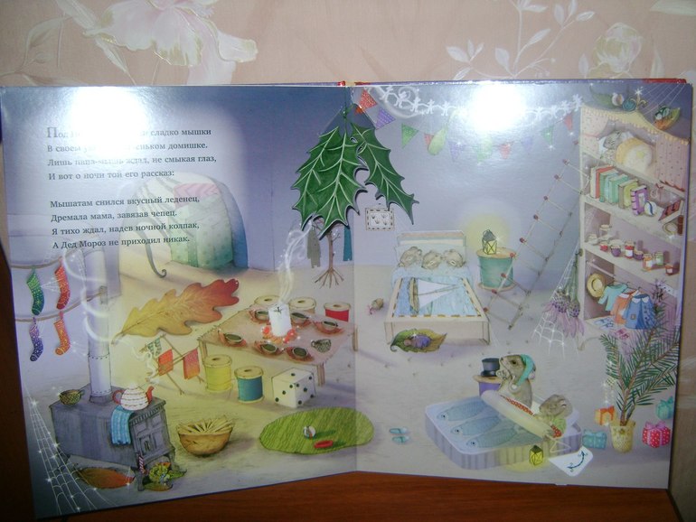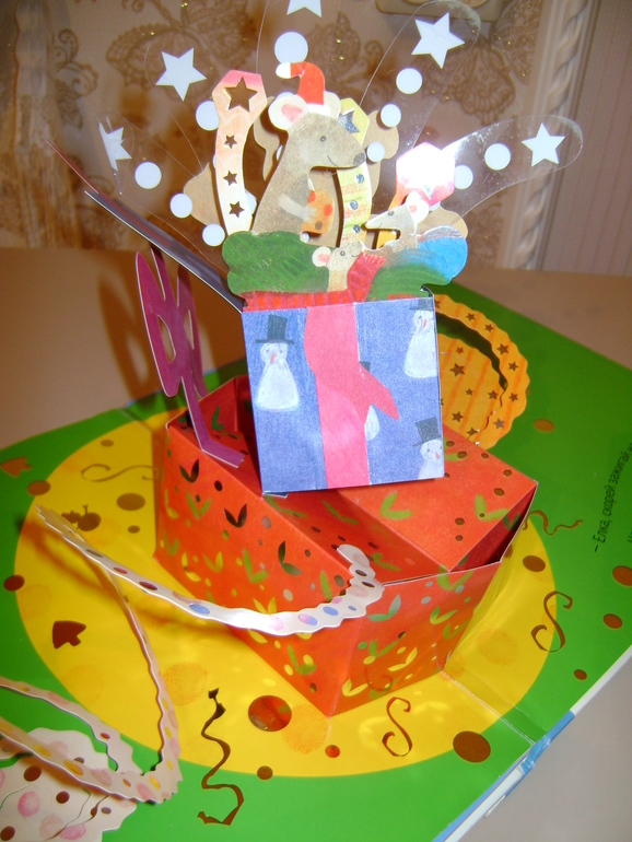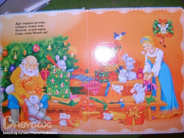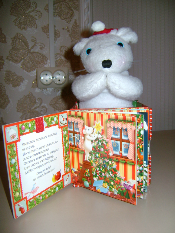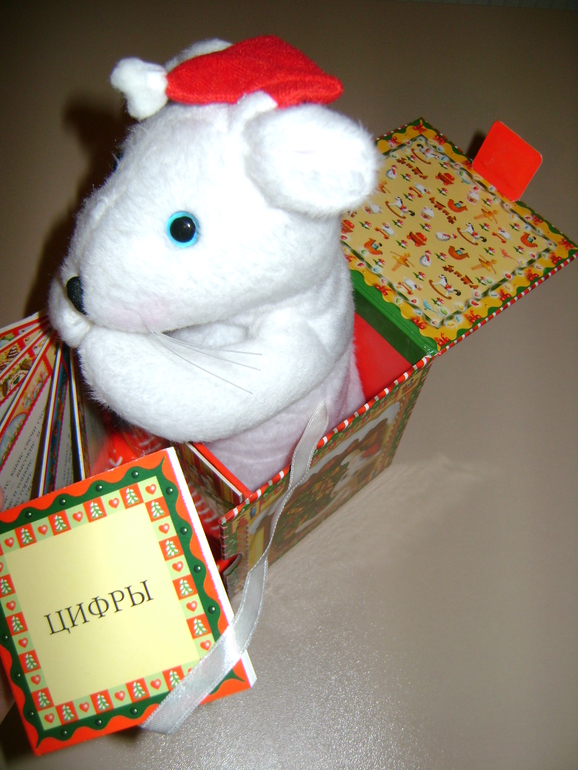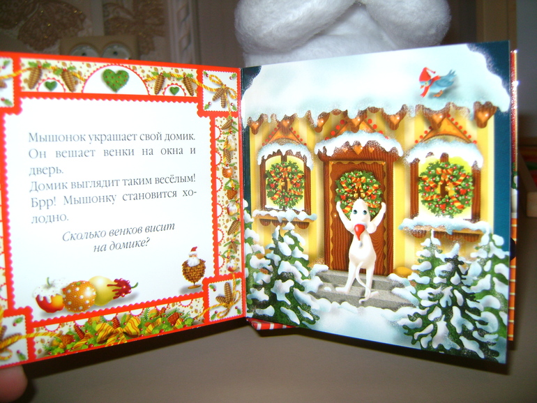 И вот такая книжечка в форме подарочной коробочки-при открытии книги из коробочки выпрыгивает забавный,рождественский мышонок-который будет сопровождать вас на протяжении всего прочтения книги(играть и вытаскивать мышонка нельзя,он прикреплен на пружинку)При помощи этой книги можно поучиться считать(правильные ответы на задания спрятаны у мышонка в маленькой книжечке,прикрепленной на тесемку)![]()