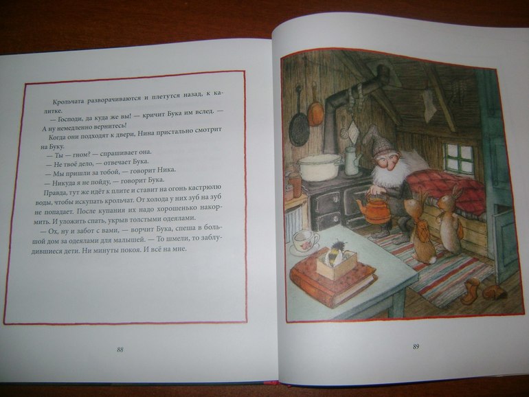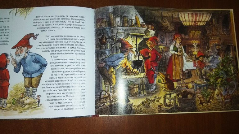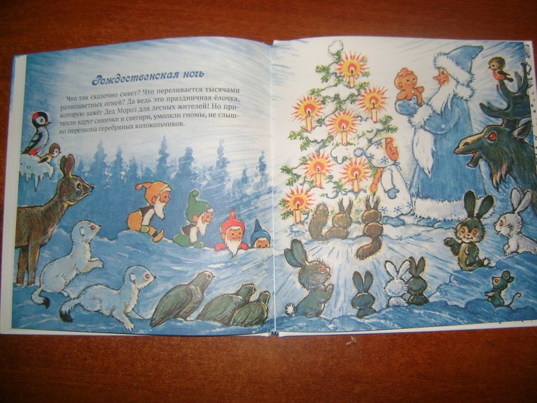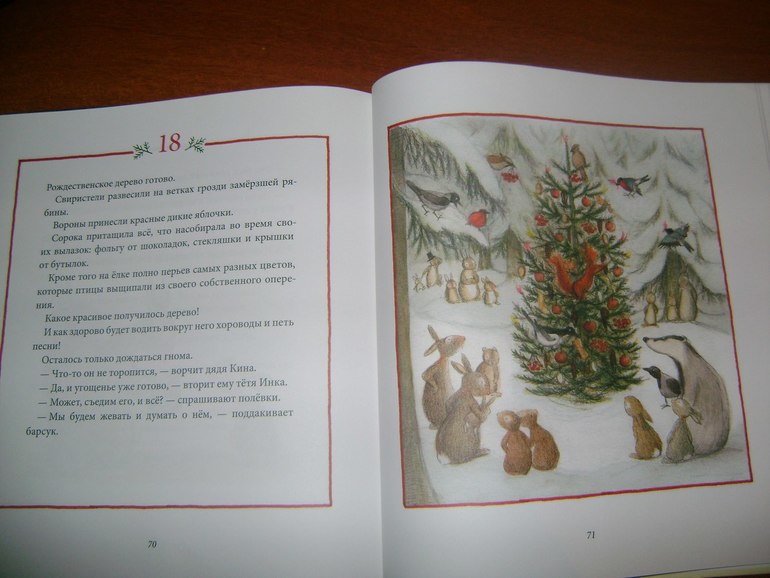 Рождество в лесу не менее интересный рассказ про ворчливого гнома Буку,как во время урагана он разозлился и ударил ногой о ворота старого дома,откуда слетела табличка и улетела прямо в лес,где звери ее не правильно прочли и поняли(вместо продаю дом,они прочли-приду,гном)вот и стали счастливые звери готовится к приходу гнома и Рождества,а гнома все не было...