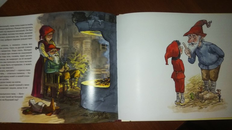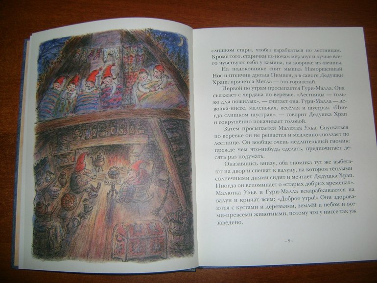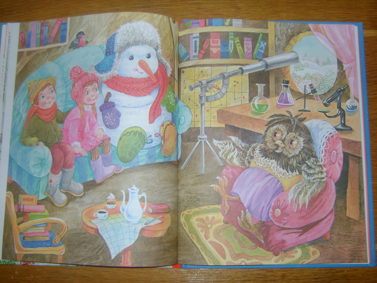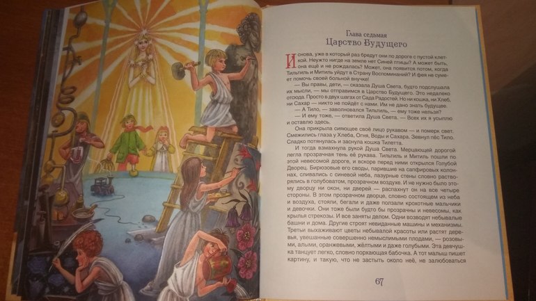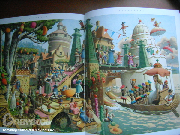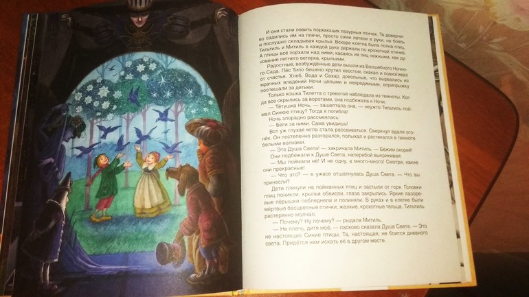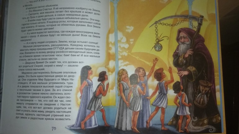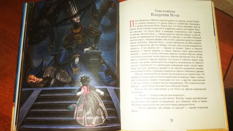 Так же они побывают во владениях царицы Ночи(жутковато изображена ночь с младенцами...рядом с ней живой младенец ,а с другой стороны...)но тем интереснее становилось погружение в рассказ для ребенка,в замках ночи за дверями скрывались призраки,ночные детские страхи и кошмары,войны,репрессии и болезни,особенно рассмешила болезнь"насморк"в виде чихающего старичка)))
