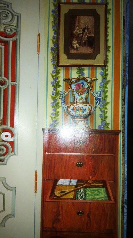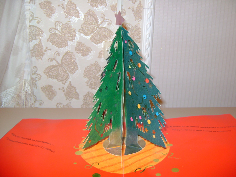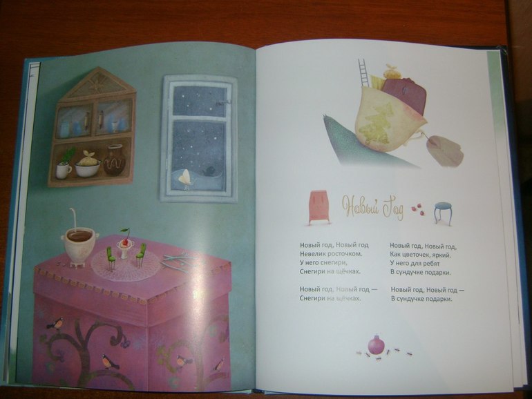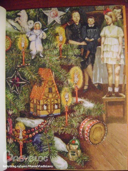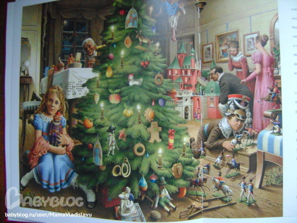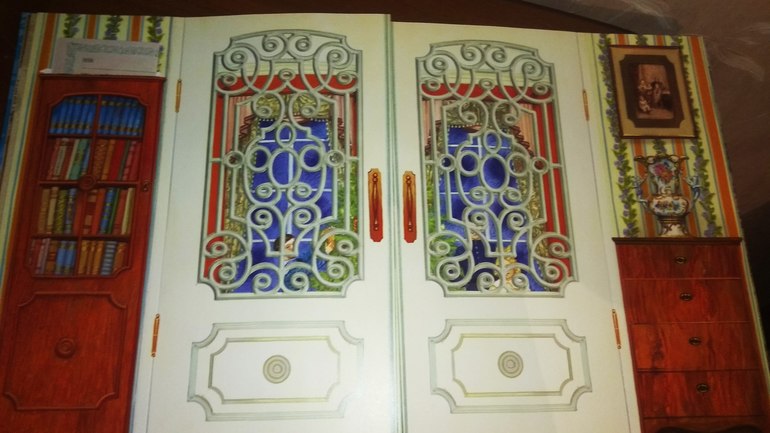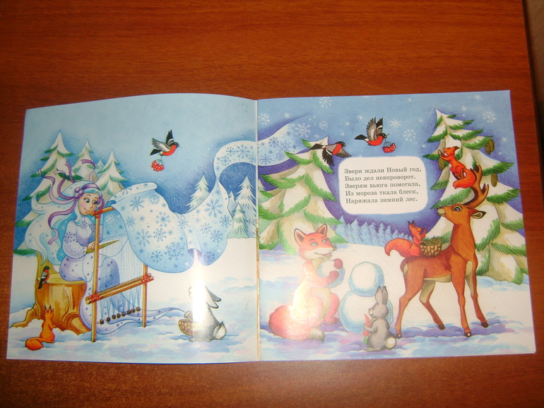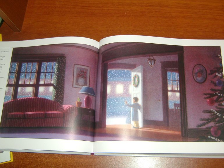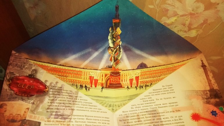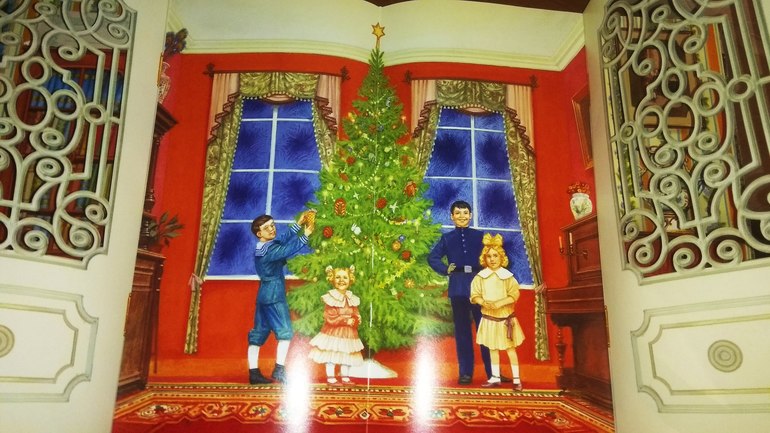Эта страничка самая любимая ребенком,тут и в ящички комода можно заглянуть,в книжном шкафу найти старую газету почитать,а за резными дверями сказочная елочка