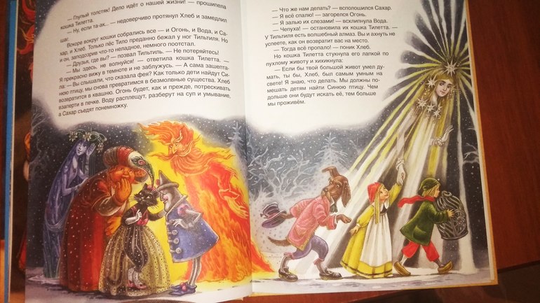 И вот тут начали происходить чудеса,что -бы брату с сестрой не идти в долгий путь одним-фея создала им живых товарищей из домашних предметов-сахар,хлеб,огонь,вода собачка и кошка станут верными друзьями ребятам