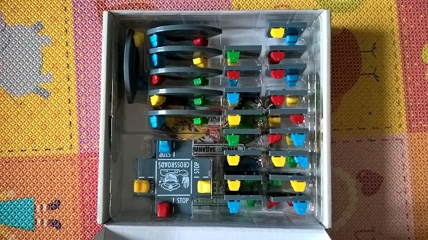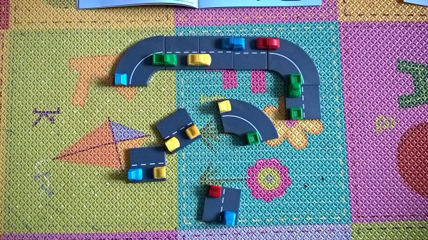 Не смогла пройти мимо настолки про машинки. Дороги надо строить так, чтобы передняя и задняя часть машин совпадали по цвету. В буклете 30 заданий на построение, от простого к сложному. Там же варианты ответов.