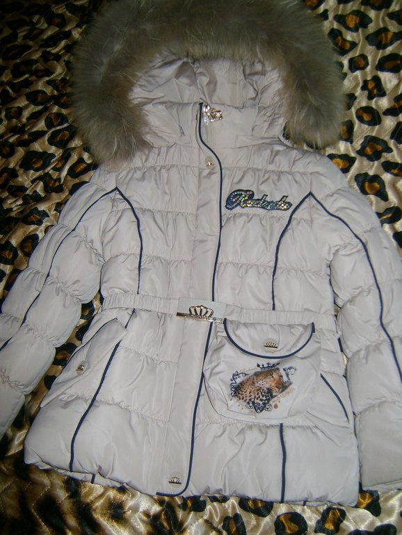Куртка имеет меховой воротник(енот) и красивую эмблему выполненную кристаллами Сваровски,на пояс пристегивается сумочка на которую нанесен принт в технике 3D