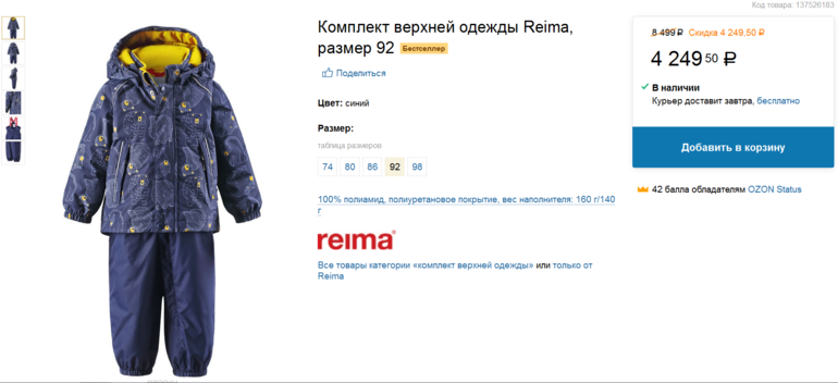 Зимний костюм Reima tec в Озоне за 4250 руб.