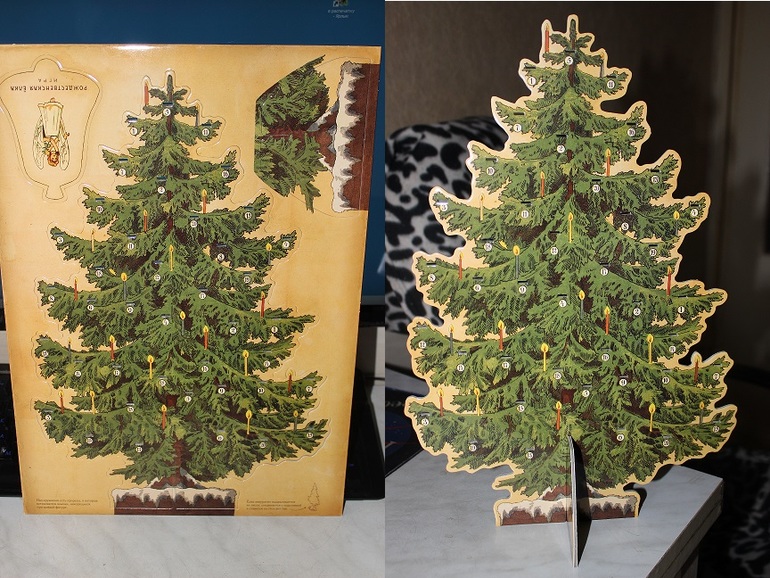 Коробочка у календаря симпатичная, хоть и тонкая. Ребенку в руки лучше не давать и боковины заклеить. Немного удивило, что даты идут вразброс, а не по порядку, ну да ладно. При желании это легко исправляется наклейками с цифрами.