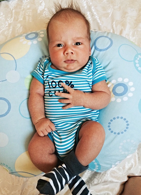Ну и утреннюю зарядку никто не отменял: на подушке Аскар тренируется держать голову.
