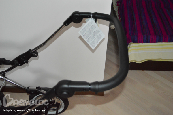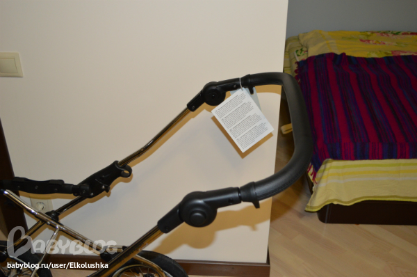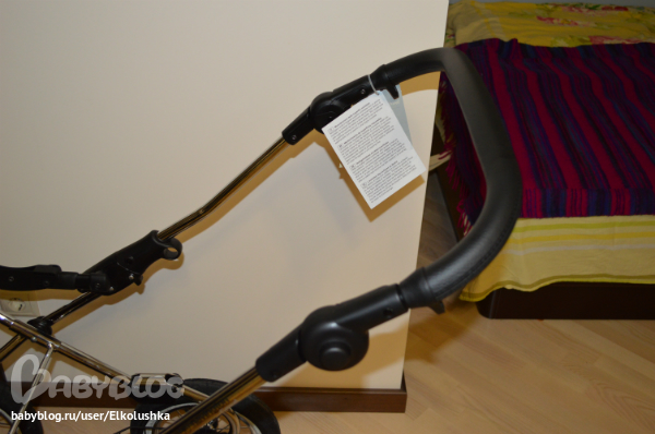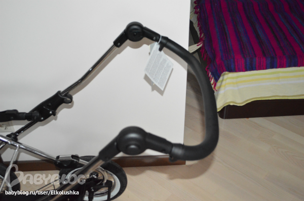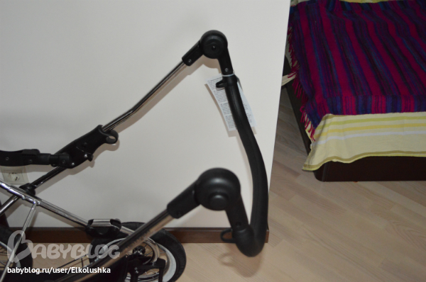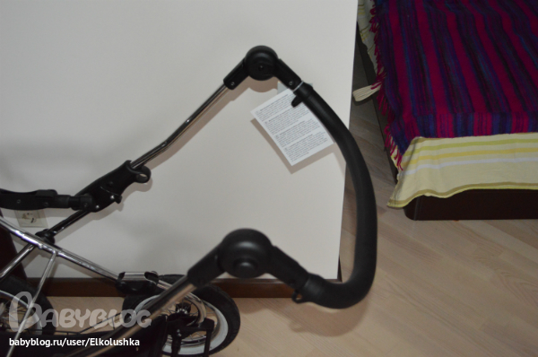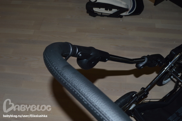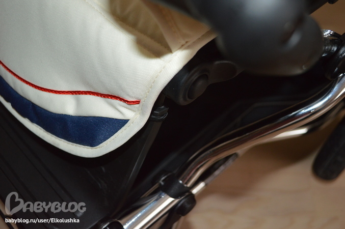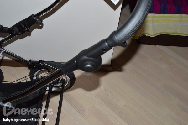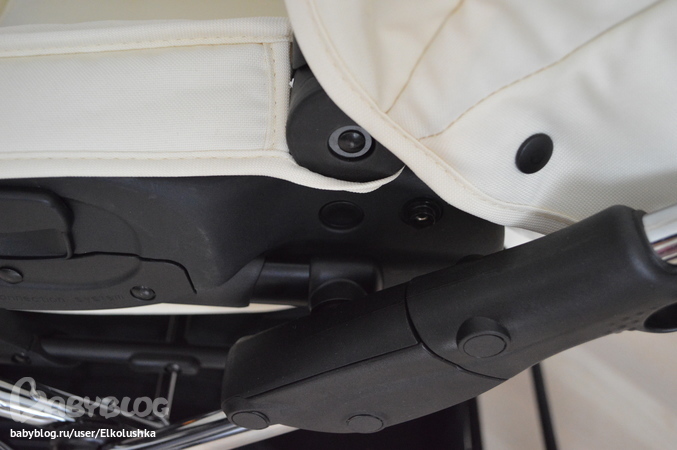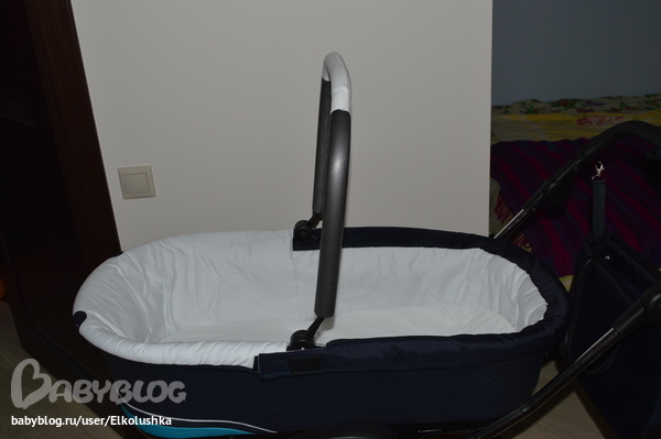 Крепится люлька на шасси, как говорится, "одним кликом"! Закрепить ее как-то не так нереально))) Тянем за вот эти ручки с двух сторон и снимаем люльку. Пока не забыла: дно и нижний край у люльки из глянцевого палстика, дно профилированное - на ровной поверхности хорошо качается, внешний борт - кожзам (на фото хорошо видны дырочки):