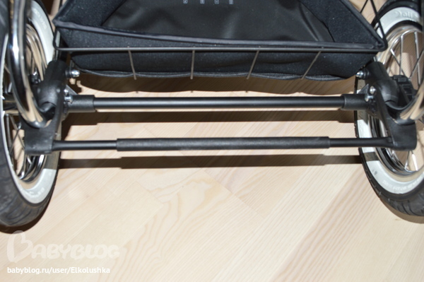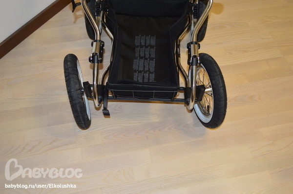 Складывается и расскладывается шасси без каких-либо усилий - я с пузиком без мужа справилась на ура :) Высота от пола до дна люльки 61 см (!). Нам с мужем (171 и 182 см) в самый раз. Помимо очевидной хорошей проходимости (благодаря в меру большим (31 см) и широким (колеса 37 см в два раза уже) надувным колесам) у шасси просто волшебная амортизация - коляска действительно плывет, как каравелла, по волнам, ее можно раскачивать как вперед-назад, так и влево-вправо. Муж, глядя на это в действии, спросил, а нельзя ли такую же побольше размером для него)))