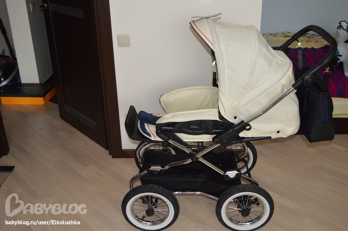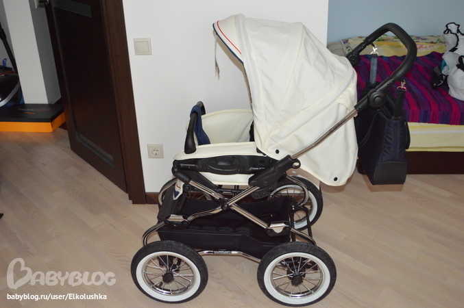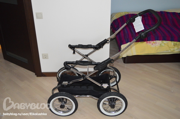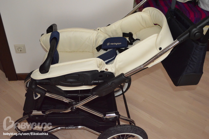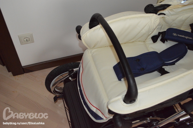 от природы делятся на классиков и новаторов что ли и я принадлежу именно к первой категории)) Да, не спорю, маленькие поворотные колеса или одно переднее колесо по-своему удобны для мамы-папы, но, что поделать, если мы с мужем постоянно смотрели на люльки на классическом шасси... В магазине мы перекатали все, что было представлено в этом сегменте, но неизменно возвращались к Navington. Что поделаешь, любопь - штука серьезная... Выбор был сделан, дело оставалось за "малым" - выбрать шасси. Поскольку в магазине был представлен только Caravel на больших колесах, то муж склонялся больше к Galeon. А меня терзали смутные сомнения, и я поехала еще раз в шоу-рум. На глазах удивленных продавцов мной был устроен настоящий тест-драйв в условиях, приближенных к реальности - в люльку положены две пачки бумаги для имитации веса ребенка, преодолены три порожка разной сложности, сделаны развороты и т.п. По сумме своих ощущений - я выбрала Caravel на колесах 31 см (то есть обычных, небольших), муж поддержал! Все именно в этом шасси как-то было мое - толщина и форма ручки, корзина и пр. Ну и шасси Caravel немного уже (производитель с выступами на колесах обозначил 62 см, в реальности где-то 59 см), чем у Galeon-Corvet (63,5 см) - не надеясь, что мне всегда будет улыбаться большой лифт, я решила подстраховаться)))
