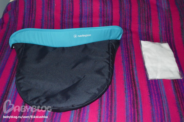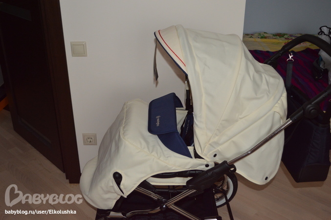 ...и на нее легко сверху надеть еще и чехол-накидку. По-моему очень интересная придумка)) Примечание: в моделях 2013 года бортик у чехла-накидки (у нашей коляски - бирюзовый) - двойной, его можно отогнуть вверх и зацепить за петельки внутри капюшона, а если еще и отстегнуть замочек на козырьке капюшона, то получиться отличная люлька для зимнего малыша. Видимо, поэтому нет и вентиляционного окошка в капюшоне. Но нам нужен был именно более летний вариант.