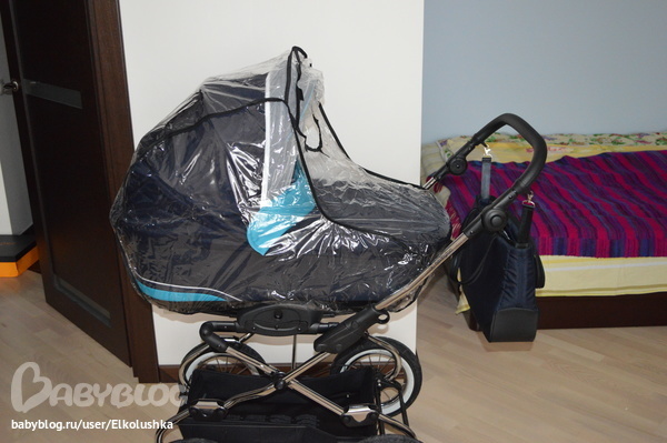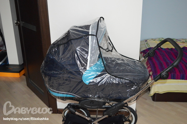 Ну и прогулочный блок в полной экипировке: москитная сеточка, накидка-чехол и дождевик (универсальный - и на люльку, и на прогулку):