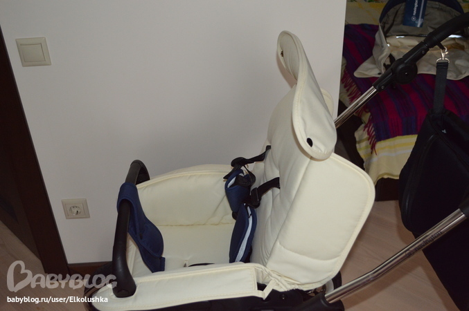 Прогулочный блок можно полностью раздеть - сняв капюшон, убрав все ремешки и застежки, нужно просто отстегнуть единую подстилку (она не просто лежит на блоке, а пристегнута липучками снизу, накидкой сверху и пластиковыми замочками на подлокотниках - все очень продумано). Но постирать ее вряд ли удастся, так как сиденье жесткое (что там внутри и как это что-то отреагирует на водные процедуры, неизвестно), так что будем обходится поверхностными водными процедурами)))