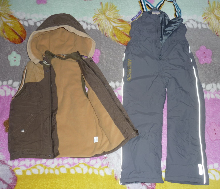 Жилет, очень теплый. Не знаю когда и с чем будем носить, взяла за копейки в районе 400 руб) Жадность)) И полукомбез Плей тудей, осень-зима, 122 р. Великоват сейчас, но если что - подверну немного и вперед)