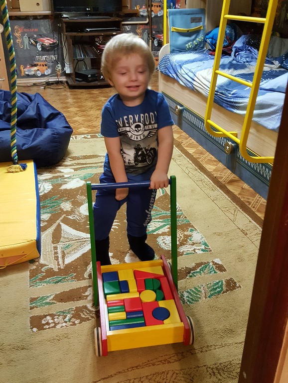 .Сын 2года уже час гоняет тележку по дому и строит башни.