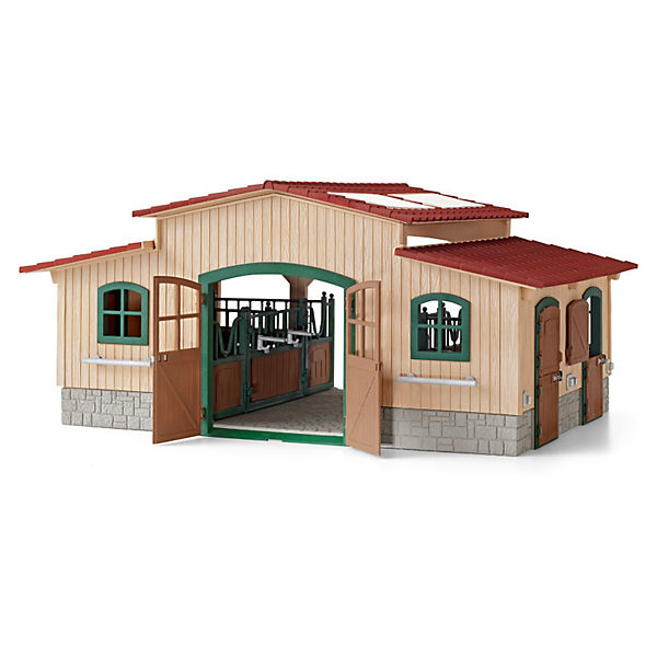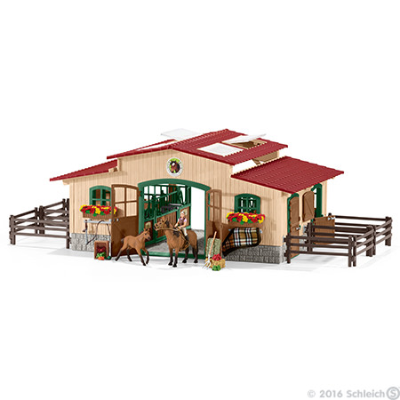 ИгрушкиДевочки. Подскажите, пожалуйста, как вам конюшня от Schleich? Сколько реально лошадей туда вмещается? И как вам качество и вообще отзывы хотелось бы услышать. Насколько она большая. Или ещё есть конюшня с аксессуарами и лошадьми, они чем то ещё различаются?