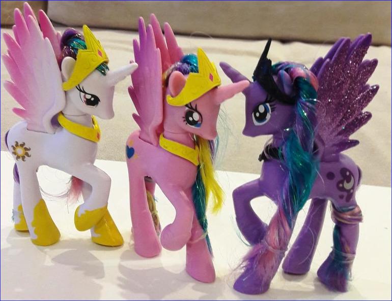 Селестия, Каденс и Луна - каждая обошлась по 238 руб. Приходят без упаковки, просто в пакетике. Но т.к. брала для своего ребенка, то это меня не смутило. Качеством (за такие деньги) я довольна. Никакого постороннего запаха нет, на ножках держатся, корона снимается. И по размеру они ближе к основным игрушкам (на фото для примера поставила Рейнбоу Дэш).