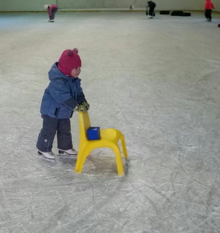 Ребенку меньше трех. К сожалению дешевые коньки имеют неправильную конфигурацию лезвия и не дают нужной устойчивости. На хороших коньках дети стоят хорошо практически сразу. Скольжение - это другое, надо часами стул катать)))