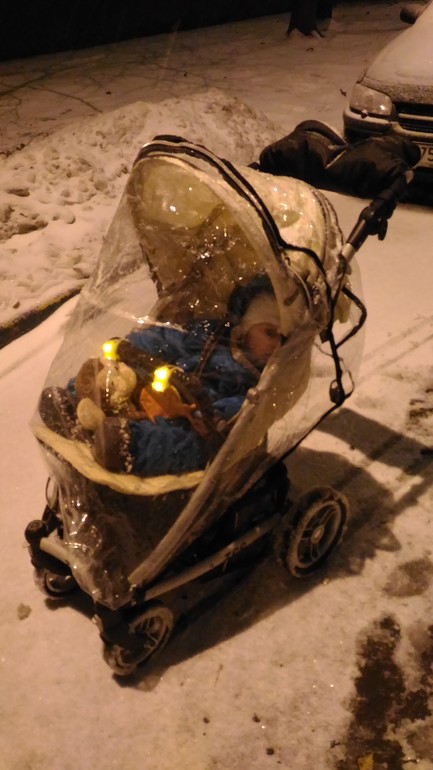 С приходом зимы в ноябре мой ребенок как-то резко разлюбил гулять, у нас сейчас такой период, что в коляске сидеть совсем неохота, а хочется или лазить по лавочке или кататься на горке, или в крайнем случае-на ручках у мамы, все осложняется тем, что ходить еще не умеем. а спина у мамы не железная, к тому же сын очень не любит варежки и гуляем мы пока до ледяных рук, то есть не очень долго( меня это кстати очень устраивает-я вообще тоже не любитель по такой погоде шататься, и с ужасом читаю посты , где мамы спрашивают -как одевать ребенка после минус 15-20) Сегодня в такой чудесный ледяной дождь, тем более сидели бы дома, но понадобилось мне дойти до двух пунктов самовывоза, а ребенку пришлось составить мне компанию. Оделась я потеплее, одела коляску в дождевик и вперед, по дороге проехались и по снегокаше и в сугроб заехали, а на обратном пути и свежевыпавший снег захватили.