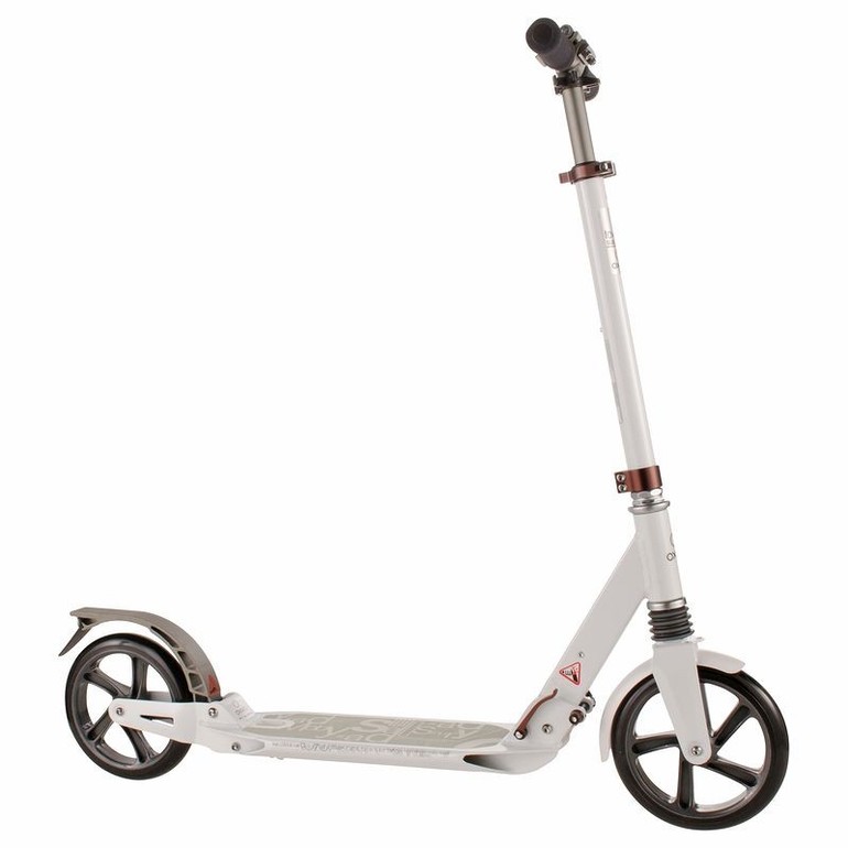 Колеса 200мм, 2 амортизатора, ход очень мягкий. На руле скоба , при затягивании которой люфт руля исчезает. Система складывания простая. С ремнем для переноски и подножкой.