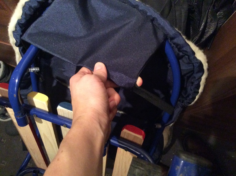 Нет сзади такой же как и весь чехол- но сверху вот такая штука на резинке есть-Ее надо перекинуть поверх спинки и никуда он не уедет) мы той зимой тоже катались на "скользкой" поверхности и норм было не куда не уезжало)))) плюс снизу вы проденете ремень от коляски и будет сидеть намертво))))Мы ту коляску продали а то я б вам сфоткала)))))