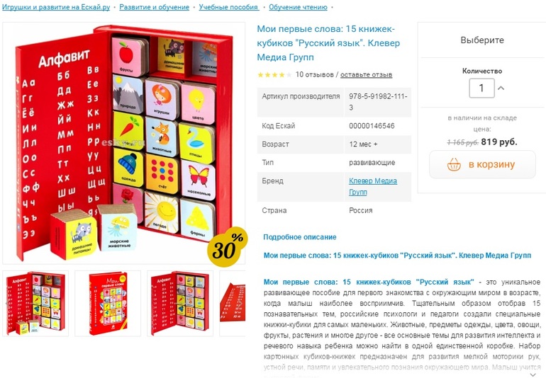 Распродажи. Скидки. Акции.Отличная цена! Я покупала за полную стоимость, ребенку очень нравится. Книжки удобного формата, можно использовать и как сортер (вкладывать обатно в ячейки), и как кубики, и учить предметы!