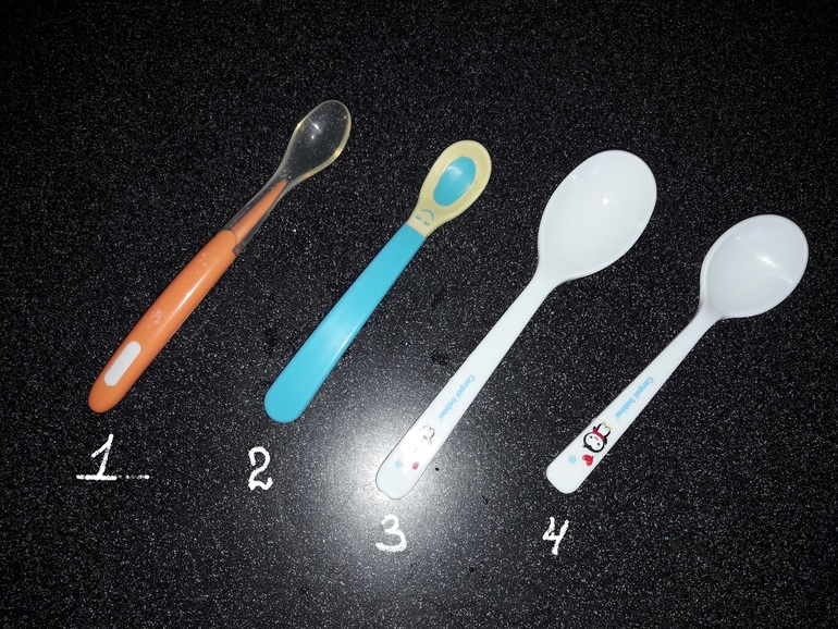 Сначала у нас были ложечки самые простые (то ли Бусинка,то ли еще как то...)мы начали прикорм с каши. №2 в наборе их 2шт. закрашиваются от еды быстро(тыква,морковь), но очень удобно кормить малыша,который не умеет брать еду с ложки губами; т.е. она без углубления вообще. но когда у малыша появляются зубы-она становится легкой добычей!№1 ложка ПО-МА 1,5мл- удачное приобретение для первого жидкого пюре. мягкая и безопасная. тоже окрашивается.