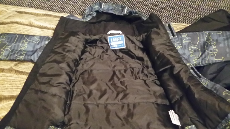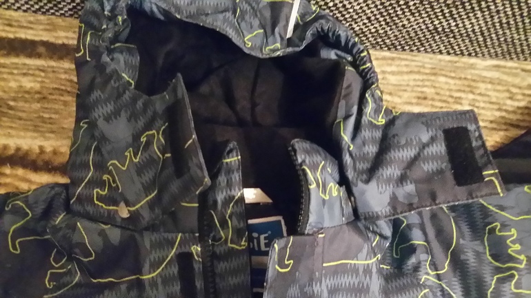 Подкладки как таковой нет (ни флиса, ни х/б) В комплекте штаны с лямками, застегиваются на молнию и кнопку. У куртки есть воротник, застегивается на липучку, капюшон сьемный. На сайте заявлен вес утеплителя 180/100. На мой взгляд демессизон, себе брала именно так. Но, все дети разные, многие ходят в таких комплектах всю зиму. Ну и еще несколько фото.