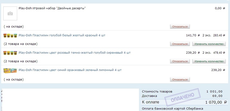Всем спасибо, разобралась)) Кладём в корзину наборы play-doh на сумму от 1000р ( если оплачиваете дополнительно Спасибо от Сбербанка, следите, чтоб итоговая сумма не стала меньше 1000р, иначе, девочки говорят, не сработает акция), оформляем заказ и через некоторое время подарок появится в обработанном заказе за 0р))