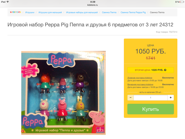 Распродажи. Скидки. Акции.Хорошая цена на свинку Пеппу и друзей на kidstore - 1050 руб и бесплатная доставка курьером! Даже в Ашане она стоит 1600 с чем-то. И также на другие наборы цена все ещё снижена после ЧП
