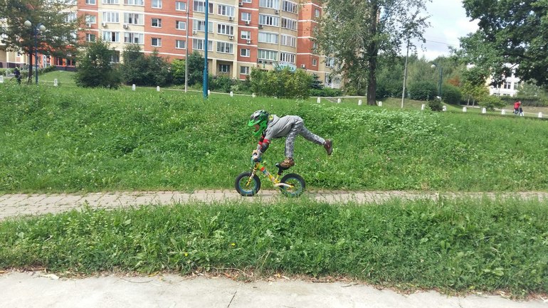 Ласточку показала. Держала беговел и показала как встать, тут же повторил в движении. Очень много "трюков" сам придумал или подглядел у парней на БМХ, как то на прогулке. придумал я имею в виду то что его не учили, например поставить ноги на руль или вилку, встать на подножку одной ногой и т.д. а потом я узнала что это трюки и их названия.