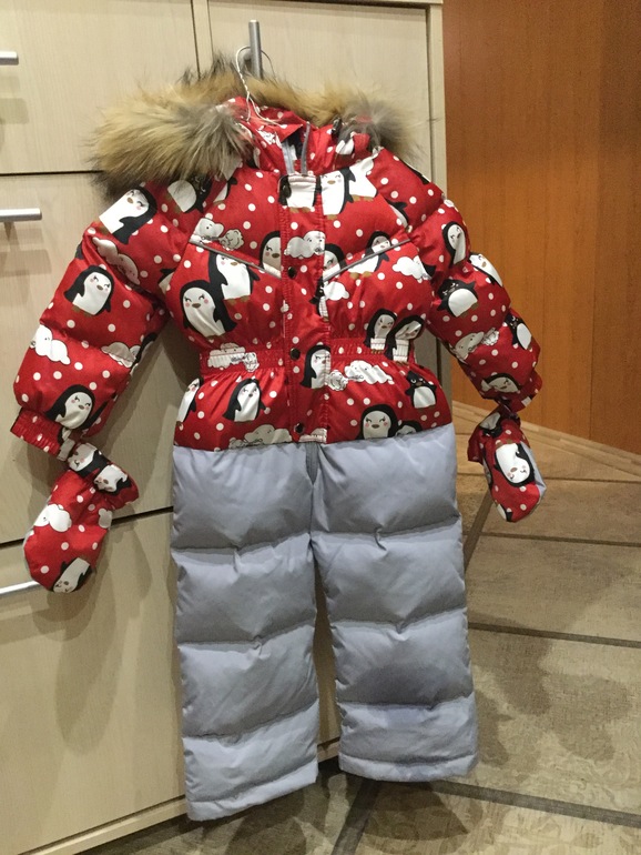 1.Комбинезон пуховый российский фирмы аксарт 86р на текущий сезон. Сомневалась, устроит ли меня качество, но покупкой довольна, очень красивый, теплый, хорошо сидит, воду отталкивает, еще и варежки в комплекте. Купила за 3500р на сайте pyzenya.