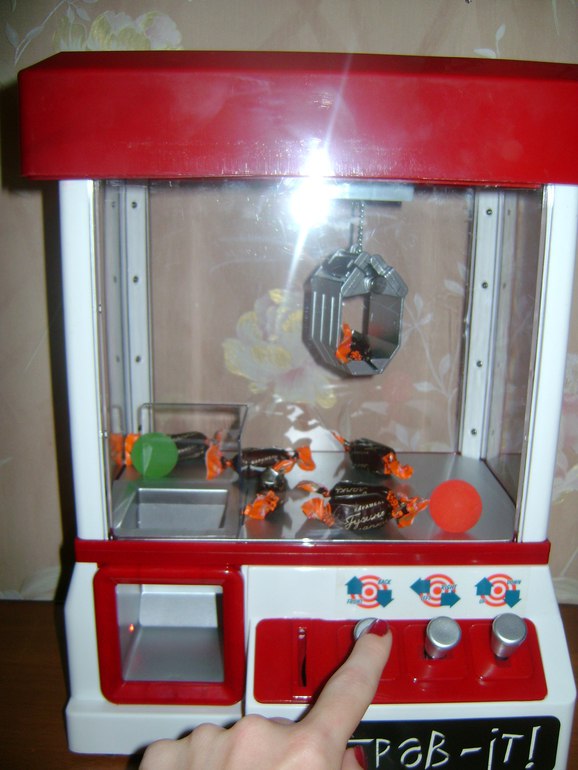 Минусы не обнаружили,по мне отличная игрушка-нужно бросить монетку и за определенное количество времени нужно достать сладость(пока играет мелодия)после чего автомат выключается и нужно снова бросать монетку(монетки в комплекте)