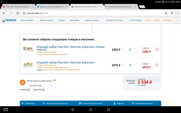 В кораблике, если пользуетесь продукцией памперс. Там при покупке на 1500 - купон на 500 рублей на игрушки. На зубастмка ещё и 30% скидка по акции. Акции суммируются и цена вообще отличная выходит
