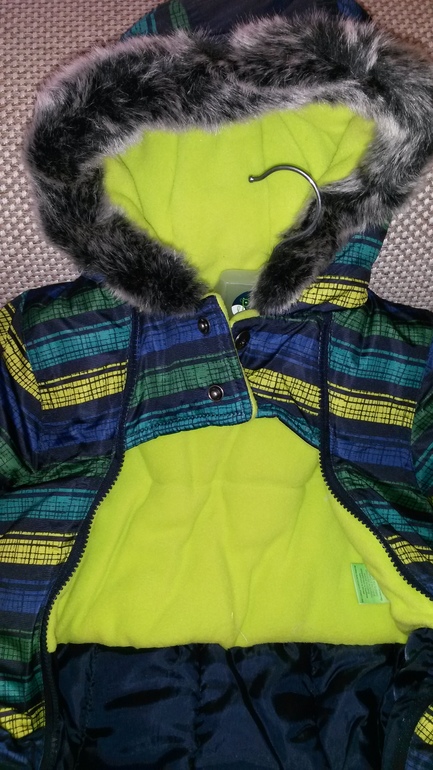 Размер 12мес. Сидит с запасом, но как-то аккуратненько всё-по фигуре. Внутри на спинке-животике-капюшоне флис. Всё качественное, яркое красивое! Горлышко доп.застегивается на планку. В комплекте пинетки и варежки-их можно в коляске надевать.