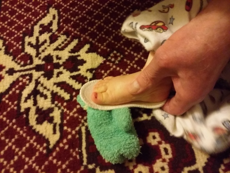 попробуйте поставить ножку малыша на пластелин расскатаный и мягкий. получите слепок. его можно измерить более точно.