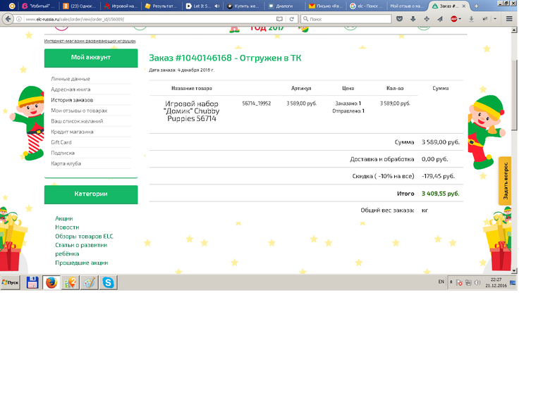 Оформила заказ (подарок на НГ для ребенка) 4 декабря, доставкой Boxberry. Было заявлено, что в течение 7 рабочих дней заказ привезут в мой город. Однако, по прошествии двух недель оповещение о доставке заказа я так и не получила. На мою претензию в службу поддержки магазина мне сообщили, что заказ не был отгружен, поскольку товара не было в наличии (хотя на момент оформления заказа на сайте было написано, что товар в наличии, статус заказа на сайте уже две недели стоял "отгружен в ТК"). Конечно, заказ я отменила, но теперь мне срочно нужно искать этот товар в своем городе, что, скорее всего, не получится. Я очень возмущена и расстроена таким отношением компании к клиентам :(((