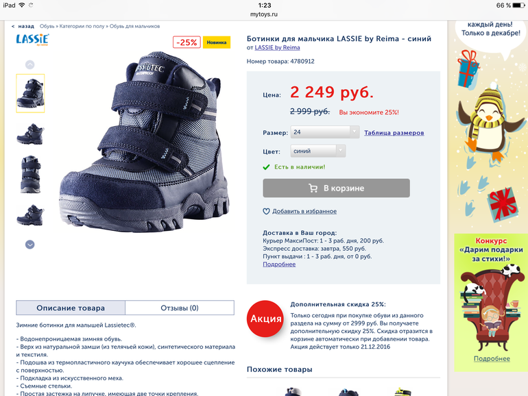 Распродажи. Скидки. Акции.Кто не спит) Mytoys пока не обновил акцию, поэтому работает скидка 25% на некоторую обувь (дополнительно отображается в корзине), есть ботинки lassie для мальчика, по акции выходят 1687 руб минус 300 руб можно применить код для нового клиента от 1500. Получается 1387 руб и есть размеры с 22 по 26.