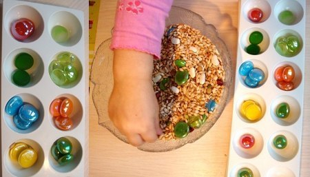 самое интересное-это нитку или леску в лапшу(отверстие широкое)продевать)и в пуговицы дать ребенку туалетную бумагу и задание-мелко ее щипать-радости не будет предела а вот с инета примеры