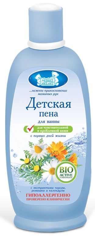 Очень люблю пену для ванн фирмы Наша мама. Хорошая косметика. Не щиплет глаза, у нас и гели, и шампуни этой фирмы. В составе пены есть экстракты трав.
