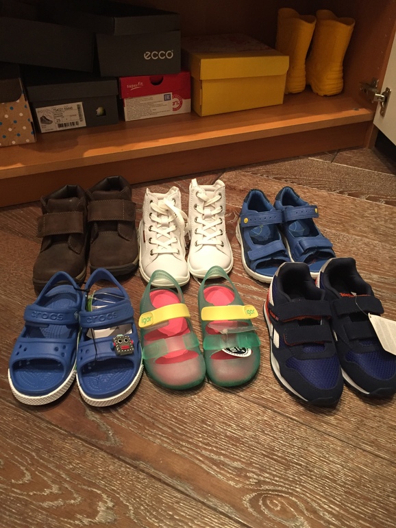 Обувка: первые тимберденды 49 евро, размер 26, белые екко размер 26, 3000 р, сандали ЭКко 26 размер цена 2500, снизу крокс синие размер с8, цена 800, далее Igor цена 19 евро, и кроссовки рибок 26 размер 1400
