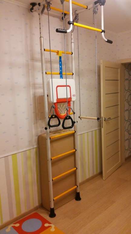 у нас обычная шведская лесенка, с приспособлением для пресса, с турником, с канатом, кольцами и веревочной лесенкой. ей уже 8 лет. купили на годик старшему. дети где-то с 1 - 1.3 забирались на нее, под присмотром. все приспособления пользуются спросом у детей!