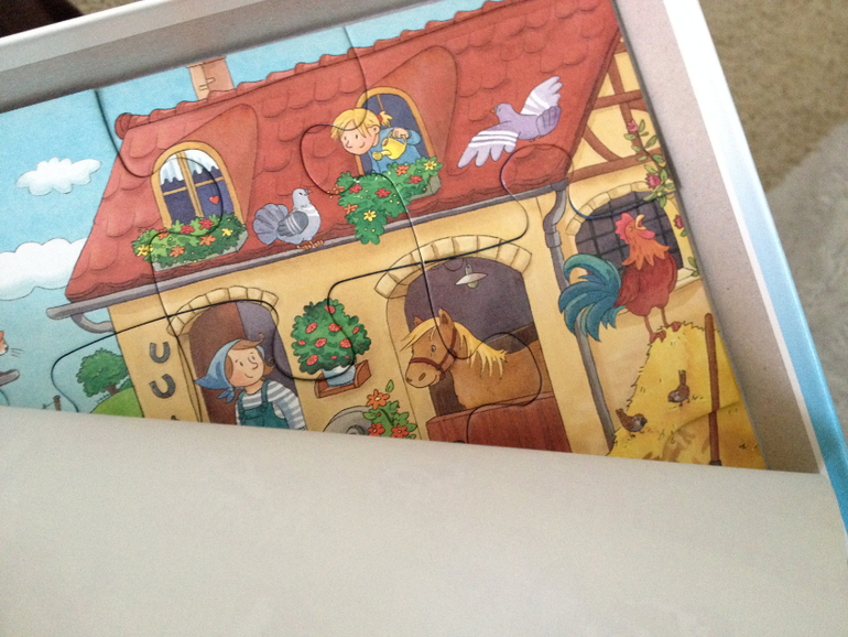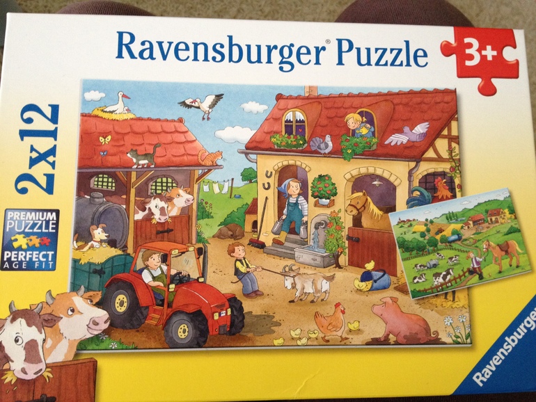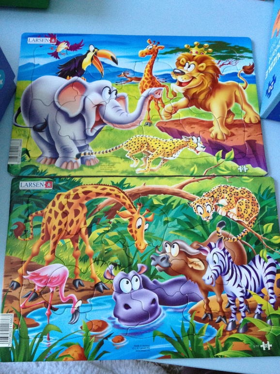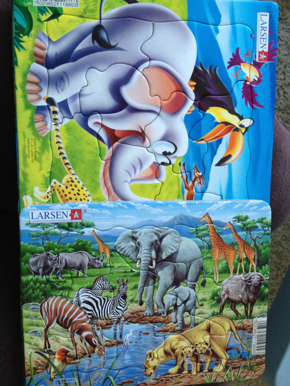 Пазлы Ларсен тоже перепали от бабушки на НГ здесь 2 маленьких и 2 средних.До этого играли только с большими,интересно было узнать будет ли ему полегче в маленьком формате собирать,ибо с большими есть трудности,когда много кусочков. Маленькие по 120 руб. вышли,средние по 195 руб где-то.