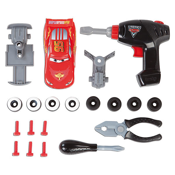Как я поняла из картинки и отзывов, в комплекте отвертка, плоскогубцы, шуроповерт (только закручивает), машина разбирается на три части + колеса, коих судя по всему 2 комплекта. Открутить можно только отверткой, насадки вроде не меняются.
