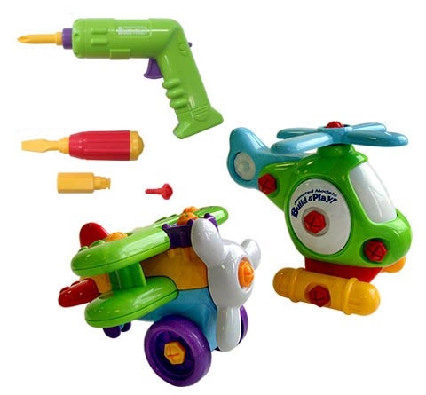 В комплекте: аэроплан (9 деталей) вертолет (10 деталей) 16 разноцветных шурупов автоматический шуруповерт отвертка 3 насадки (плоская, крестовая, шестигранник) Для работы шуруповерта необходимы 2 батарейки типа АА (входят в комплект).